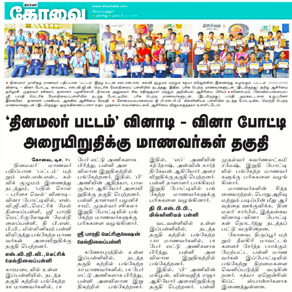 Congratulations to Shri Hari, Gowtham Sivasailam, and Maheswaran on their impressive wins! They secured 1st place in the Rotary Galaxy Science Quiz, competing against various teams in the city and later bagged 3rd position in the state-level Rotary Quiz Final event at Chennai. Their awards included Galaxy phones and recognition for their achievements.