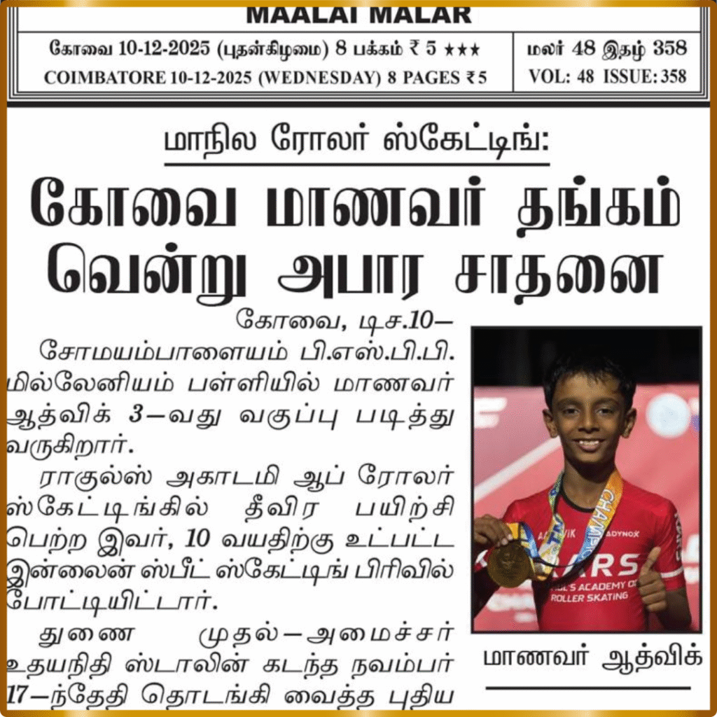 | 9 | NIKKITHA G | 2023 | U 12 CBSE ZONAL | SKATING | BRONZE |