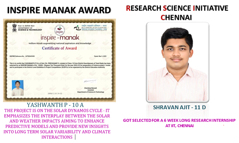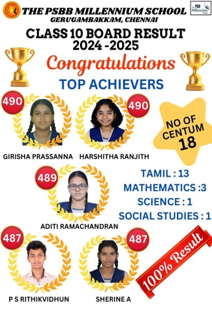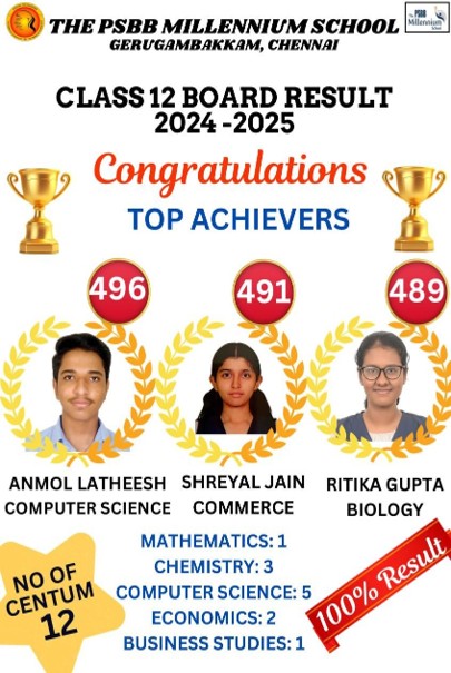 Academic Achievements Academic Achievements 2015 – 2025 School Toppers List of Classes X AY (2015 – 2025)S. No.Academic YearClass XName of the StudentMarks12024 – 2025GIRISHA PRASSANNA49022023 – 2024MRIDULA ANAND49332022 – 2023AKANSHA MALLICK49442021 – 2022S ANU PRIYA49452020 – 2021SAHANA MAHESH49662019 – 2020R MEENAKSHI49472018 – 2019VINAYAGI T49082017 – 2018JENITA ANNLINE. A48982024 – 2025HIRANMAI MOHAN48910HARSHITHA RANJITH490 School Toppers List of Classes XII AY (2015 – 2025) S. No. Academic Year Class XII Name of the Student Stream Marks 1 2024 – 2025 ANMOL LATHEESH COMPUTER SCIENCE 496 SHREYAL JAIN COMMERCE 491 RITIKA GUPTA BIOLOGY 489 2 2023 – 2024 ANSHUL SINGH COMPUTER SCIENCE 483 PRAJIN K COMMERCE 479 SAI SHRUTI SUBRAMANIAN COMMERCE 478 PRANAV KARTHIK A BIOLOGY 482 3 2022 – 2023 PRANAV JAIGANESH COMPUTER SCIENCE 490 MANASHREE KRISHNAN COMMERCE 484 HARSHITH ROSHAN KRISHNA KUMAR BIOLOGY 486 4 2021 – 2022 S NEEHARIKA COMPUTER SCIENCE 494 V NEELESH COMMERCE 487 SHRAVAN BALAJI BIOLOGY 489 5 2020 – 2021 LESHYA A COMPUTER SCIENCE 490 ANSHULA RAVI COMMERCE 486 NITHILAMEENA MUTHIAH BIOLOGY 487 P TEJASVI PRASSANNA BIOLOGY 487 6 2019 – 2020 HIRANMAI MOHAN COMPUTER SCIENCE 490 SUDARSHAN. R.S.A COMMERCE 489 SUPRAJA. S COMMERCE 489 SONESH KUMAR SWAIN BIOLOGY 485 7 2018 – 2019 MEGANA THAMILSELVAN BIOLOGY 491 S HARIKRISHNAN COMMERCE 478 RAHUL PRAKASH COMPUTER SCIENCE 482 8 2017 – 2018 NEHA B BIOLOGY 485 VAIBHAV B R COMMERCE 473 JAYAMATHANGI SRINIVASAN COMPUTER SCIENCE 484 9 2016 – 2017 ROHITH P COMPUTER SCIENCE 474 SHREE THAARSHINI S HUMANITIES 484 AAMEENA APROSE KATHIJA.M BIOLOGY 478 NIKITA JOSE COMMERCE 474 10 2015 – 2016 A DIVYA COMPUTER SCIENCE 489 RAHUL R COMPUTER SCIENCE 489 SHIVPRIYA MAHESH COMMERCE 483 VEDHALAXMI M K BIOLOGY 477 Achievements AY (2024 – 2025) Indian Institute of Technology & National Institute of Technology SHAKTHI MIRNALINI T S 12C, BACHELOR OF DESIGN AARUSHI SRIDHAR 12D, B ARCH, NIT, TRICHY NILA KATHIR 12D, BACHELOR OF DESIGN, IIT GUHWATI ANSHUL SINGH 12D, B TECH, M TECH, GAUTHAM RAJ 12D, BACHELOR OF DESIGN MEDICINE ANUPRIYA S 12A, AKSHAY KUMAR 12A, MBBS, SLIMS, PUDUCHERRY SUBHASHREE S 12B MBBS, VELAMMAL MEDICAL COLLEGE, MADURAI (NEET SCORE 627) SHREEYA S 12B, MBBS, MGM, PONDICHERRY AVANTIKA 12B, MBBS, SRI MUTHUKUMARAN MEDICAL COLLEGE MADHUMITA R 12C, MBBS, CHETTINAD HOSPITAL AND RESEARCH INSTITUTE FOREIGN UNIVERSITY ABHIRAAJ DATTA 12ANEURO SCIENCE,UNIVERSITY OF MICHIGAN ASHWIN VINOD KUMAR 12CAPPLIED MATH AND COMPUTER SCIENCE,HARVARD UNIVERSITY AYAAN JAMIL 12CB.SC. DATA SCIENCE,AALTO UNIVERSITY, FINLAND PRAJAN M R 12CBS COMPUTER SCIENCE,TEAS STATE UNIVERSITY DHANUSHRI 12DBS COMPUTER SCIENCE & MATHEMATICS,PURDUE UNIVERSITY, US SMRITHI SENTHIL NATHAN 12DBA JOURNALISM & DATA SCIENCE,UNIVERSITY OF CALIFORNIA, BERKELE PRANEY S 12EBBA,SINGAPORE INSTITUTE OF MANAGEMENT NITHIN K 12BMBBS,UNIVERSITY OF BUCKINGHAM FOREIGN UNIVERSITY Achievements AY (2023 – 2024) CBSE – BOARD EXAM RESULT - AY 2023-24 -STD XII STREAM TOPPER COMPUTER SCIENCE(483/500)ANSHUL SINGH 12D BIOLOGY(482/500)PRANAV KARTHIKA COMMERCE(479/500)PRAJIN K 12F Indian Institute of Technology & National Institute of Technology ARAVIND CHANDRAMOULI (486)99.4 PERCENTILE IN JEEIIT MADRAS ENGINEERING DESIGN PRANAV J (490)99.3 PERCENTILE IN JEEIIT KHARAGPUR MECHANICAL ENGINEERING HARISH S (458)97.5 PERCENTILE IN JEENATIONAL INSTITUTE OF TECHNOLOGY ELECTRICAL AND ELECTRONICAL ENGINEERING ANSHUMAN PADHI (474)RANK 38910 IN JEENATIONAL INSTITUTE OF TECHNOLOGY BTECH IN MECHANICAL ENGINEERING SUNDAR S (454)93.3 PERCENTILE IN JEENATIONAL INSTITUTE OF TECHNOLOGY MECHANICAL ENGINEERINGNITHIN K 12BMBBS,UNIVERSITY OF BUCKINGHAM Medicine ISHA D (479)SCORED 520 IN NEETSRI RAMACHANDRA MEDICAL COLLEGE AND RESEARCH INSTITUTE ADITYA KHANNA (479)SCORED 516 IN NEETESI-PGIMSR, KK NAGAR SAHASYAA A (474)SCORED 635 IN NEETMADRAS MEDICAL COLLEGE SAI RITHIK M (474)SCORED 635 IN NEETCHENGALPATTU MEDICAL COLLEGE Foreign University KAUSAL RISHAB KUMAR (470)98.1 PERCENTILE IN JEEUNIVERSITY OF MICHIGANAEROSPACE ENGINEERING ADITYA KHANNA (479)SCORED 516 IN NEETESI-PGIMSR, KK NAGAR SAHASYAA A (474)SCORED 635 IN NEETMADRAS MEDICAL COLLEGE ISHA D (479)SCORED 520 IN NEETSRI RAMACHANDRA MEDICAL COLLEGE AND RESEARCH INSTITUTE ADITYA KHANNA (479)SCORED 516 IN NEETESI-PGIMSR, KK NAGAR SAHASYAA A (474)SCORED 635 IN NEETMADRAS MEDICAL COLLEGE Overview Our Story Academic Approach Parents Speak Alumni Speak Admission Procedure Overview Our Story Academic Approach Parents Speak Alumni Speak Admission Procedure