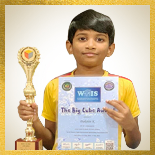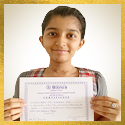 Extra-Curricular Achievements ACADEMIC YEAR 2024-2025 ANIRUDH SRIDHAR (9G) - ROUND ROBIN TOURNAMENT U16 TEAM -SELECTED IN TEAM SARVESH KANNAN (10D) - INTERNATIONAL OLYMPIAD -SCORED 41st RANK D.SHIVENDRAAHARI (2F) - CHESS TOURNAMENT -WON MEDALS AND TROPHY JAYANT SINHA - TAMIL COMPETITIONS -JAYANT SINHA – 3RD PRIZE DHARSHITHA - TAMIL COMPETITIONS DHARSHITHA – 2ND PRIZE HARSHINI S - TAMIL COMPETITIONS ACADEMIC YEAR 2023-2024 GOKULAN (UKG D) - SIMARTIAL ARTS COMPETITION-FIRST THARUNIKA (UKG H) - ART WORK IN "RAVIVARMA” -CERTIFICATE OF EXCELLENCE KAVINESH S (UKG B) - KARATE CHAMPIONSHIP, -SECOND THANYAA SRI (3G) -CHESS TOURNAMENT -JSECOND MITHUN S (2A) - KARATE CHAMPIONSHIP -FIRST ACADEMIC YEAR 2022-2023 INIYA J (4D) - GENERAL KNOWLEDGE -STATE RANK 6 SHREYAL JAIN (9A) - RAJAJI ELOCUTION COMPETITION -3rd Prize DAKSHIN K (4) - STATE LEVEL SILAMBAM COMPETITION -1st prize HARIPRIYAN V (8B) -ASIAN KARATE -SECOND DHANVIN V (6G) - OPEN TENNIS TOURNAMENT -WINNER ACADEMIC YEAR 2021-2022 DARSHANA MARAN (3 B) - SILAMBAM -WINNER ASHMITHA ASHOK (9C) - TOASTMASTER SPEECH COMPETITION -WINNER DARSHA (2F) - SILAMBAM COMPETITION -MASS WORLD RECORD TOSHINI R (6A) -PRAVESHIKA HINDI EXAM -WINNER SRIJA KONDURU (12) - NATIONAL ART COMPETITION -FIRST ACADEMIC YEAR 2020-2021 HANSINI SRIRAMAN (2A) - Sayataru Creation Pencil Sketch Online Challenge 2020 -Within Top 10 S. S. Harshithvel (3F) -L & T's Inaugural Pedaling Sport Event (Conducted Virtually) Pranesh S. B (UKG) - State Level Art Competition 2020 - 21 organised by Centre for Indian Art Resources and Training (CIART), Mumbai -Second Place Sai Sabaresh T (3C) -GVCA Online Chess Tournament -First Place Srivanth Srinivasan (2F) - Yaathumagi Ninraai - Navaratri Talent Fest - Story Telling -Certificate Appreciation Overview Our Story Academic Approach Parents Speak Alumni Speak Admission Procedure Overview Our Story Academic Approach Parents Speak Alumni Speak Admission Procedure